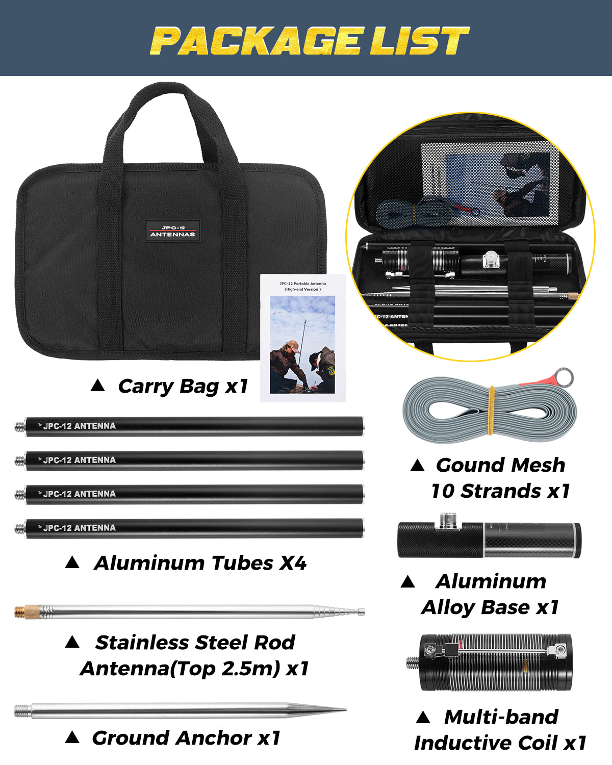 - 【Package Contents】 The package contains Aluminum Tubes *4, Stainless Steel Rod Antenna (Top 2.5m) *1, Ground Anchor *1, Ground Mesh 10 Strands *1, Aluminum Alloy Base *1, and Multi-band Inductive Coil *1. The antenna is stable, durable, and corrosion-resistant, designed for easy installation in grass or sand. All components pack into a compact black carry bag