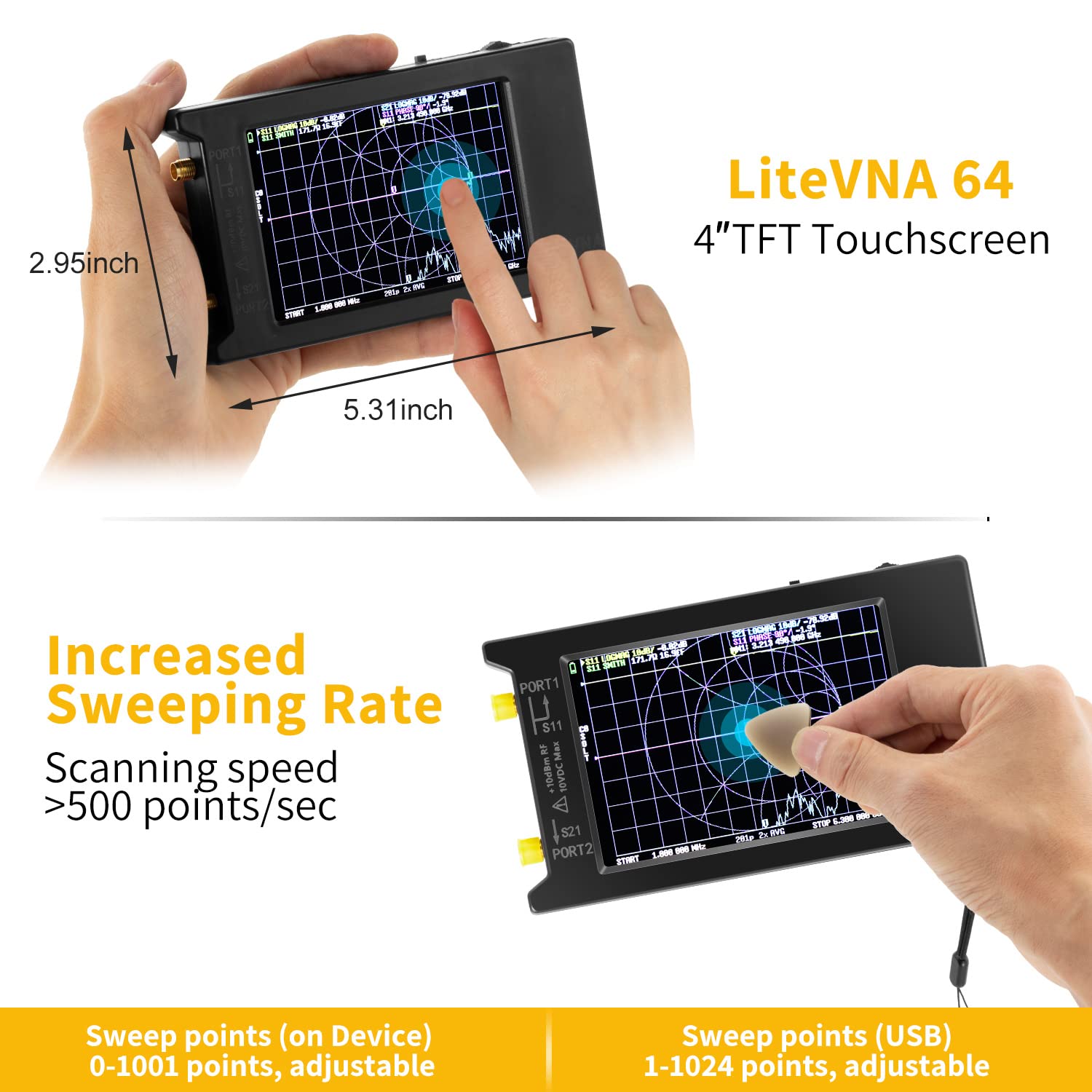 - 【The Latest Portable NanoVNA】 Based on and combined with NanoVNA and SAA2 VNA, the vna is as portable as NanoVNA, while can accomplish 50kHz-6.3GHz ultra-wide measurement frequency range as a tiny handheld NanoVNA. The 3.95"(approx 4'') touchscreen (480×320) version of the VNA 64 maintains the same dimensions and operates the same as the NanoVNA-H4 with 2000mAh rechargeable battery
